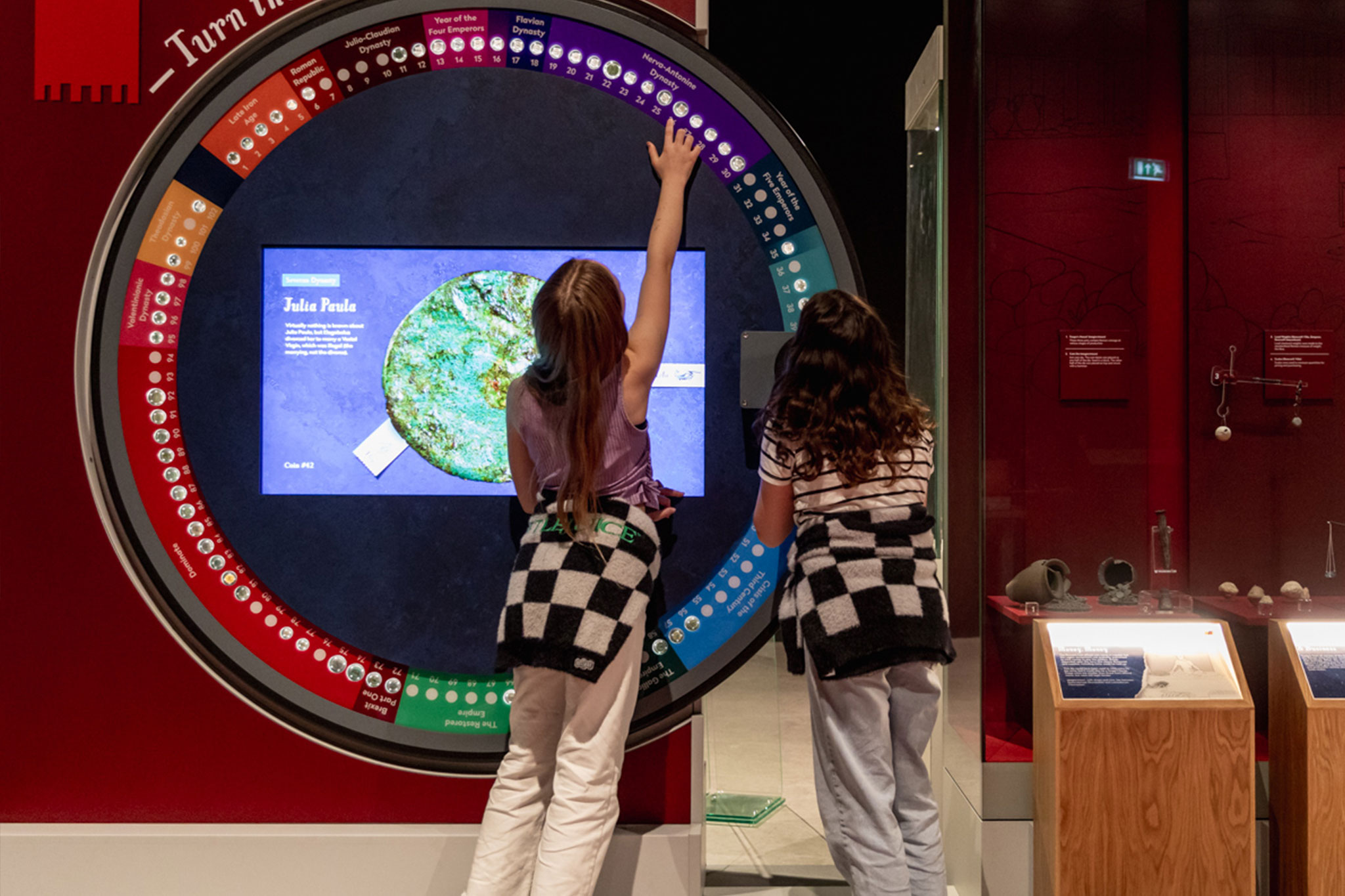 In partnership with Aivaf we developed the Roman Coins interactive, a giant rotating wheel containing 71 original coins dating from 50 BC, detailing the period and which Roman rulers the coins related to. It also allows you to virtually flip the coin so you can see the other side.